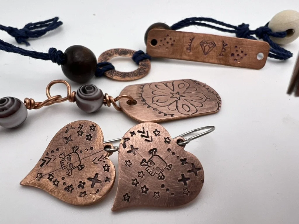 Make your own earrings, bracelets, pendants, or keychains using steel stamps and hammers. Taught by local artist Natalie Esfahanian. Make as many pieces as the time allows! Copper and aluminum blanks for stamping are included in the workshop price. If anyone wants to use sterling silver, there will some be options available for an additional cost. Those can be purchased during the workshop.